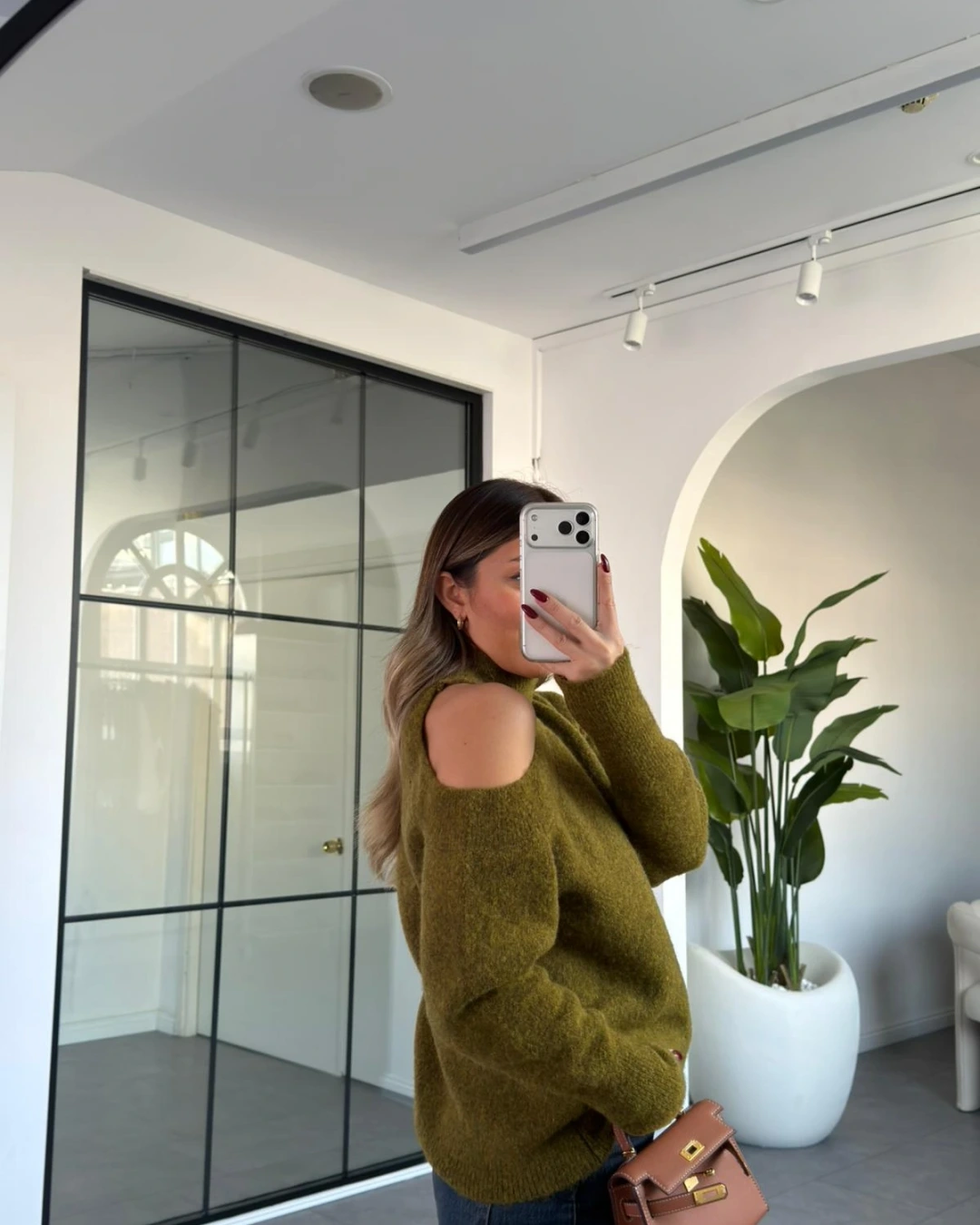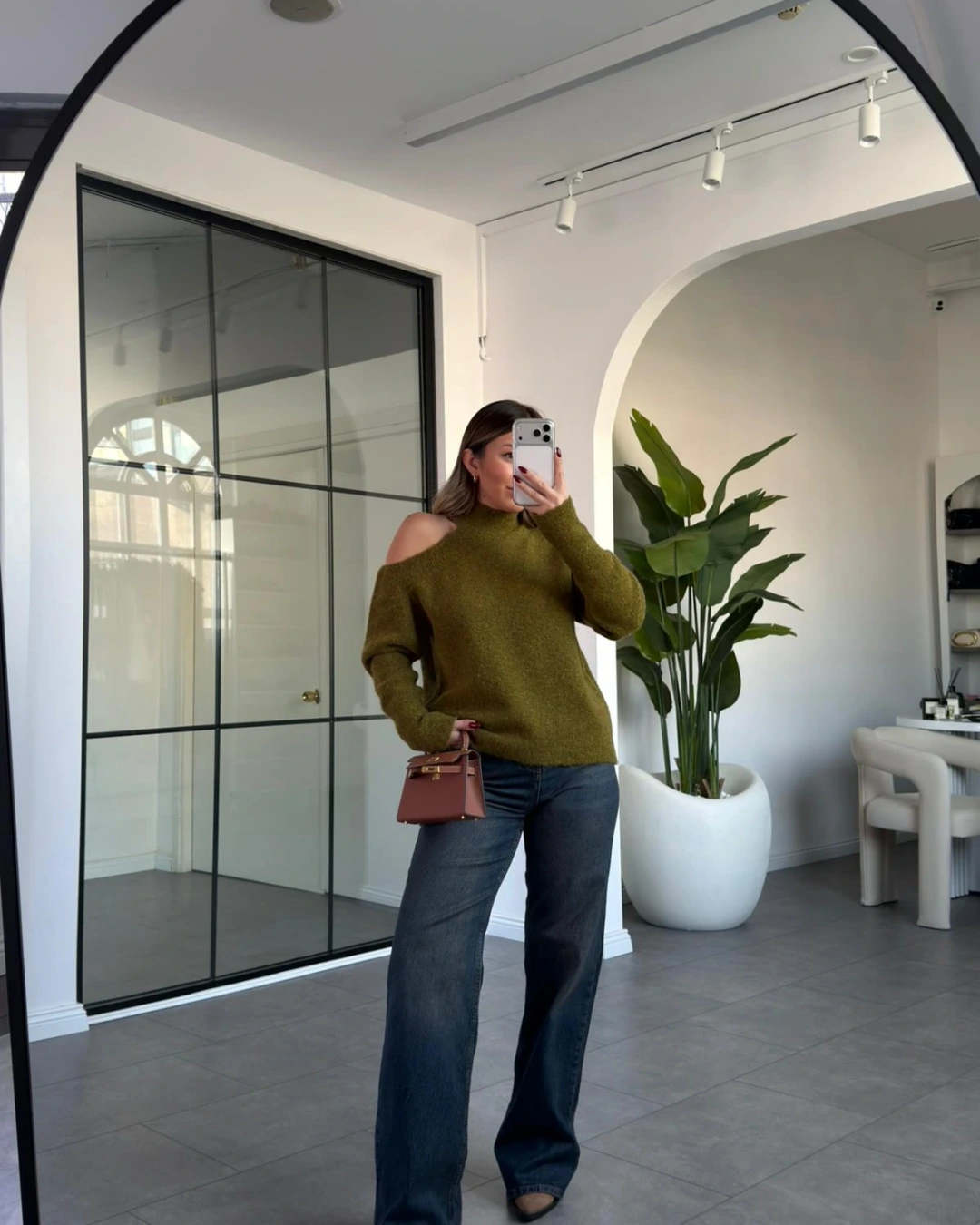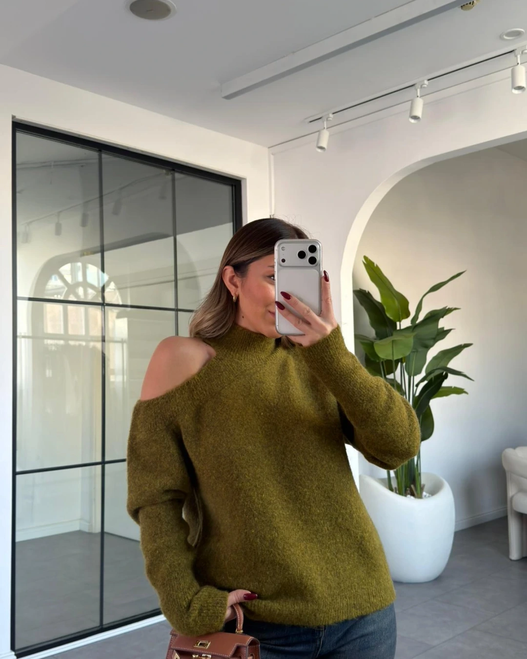 YAĞ YEŞİLİ OMUZ DETAYLI KAZAK