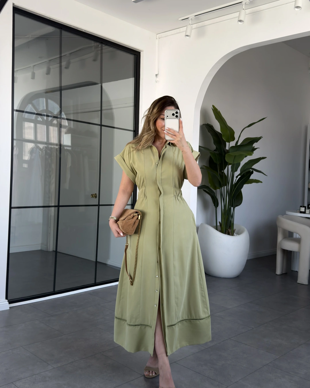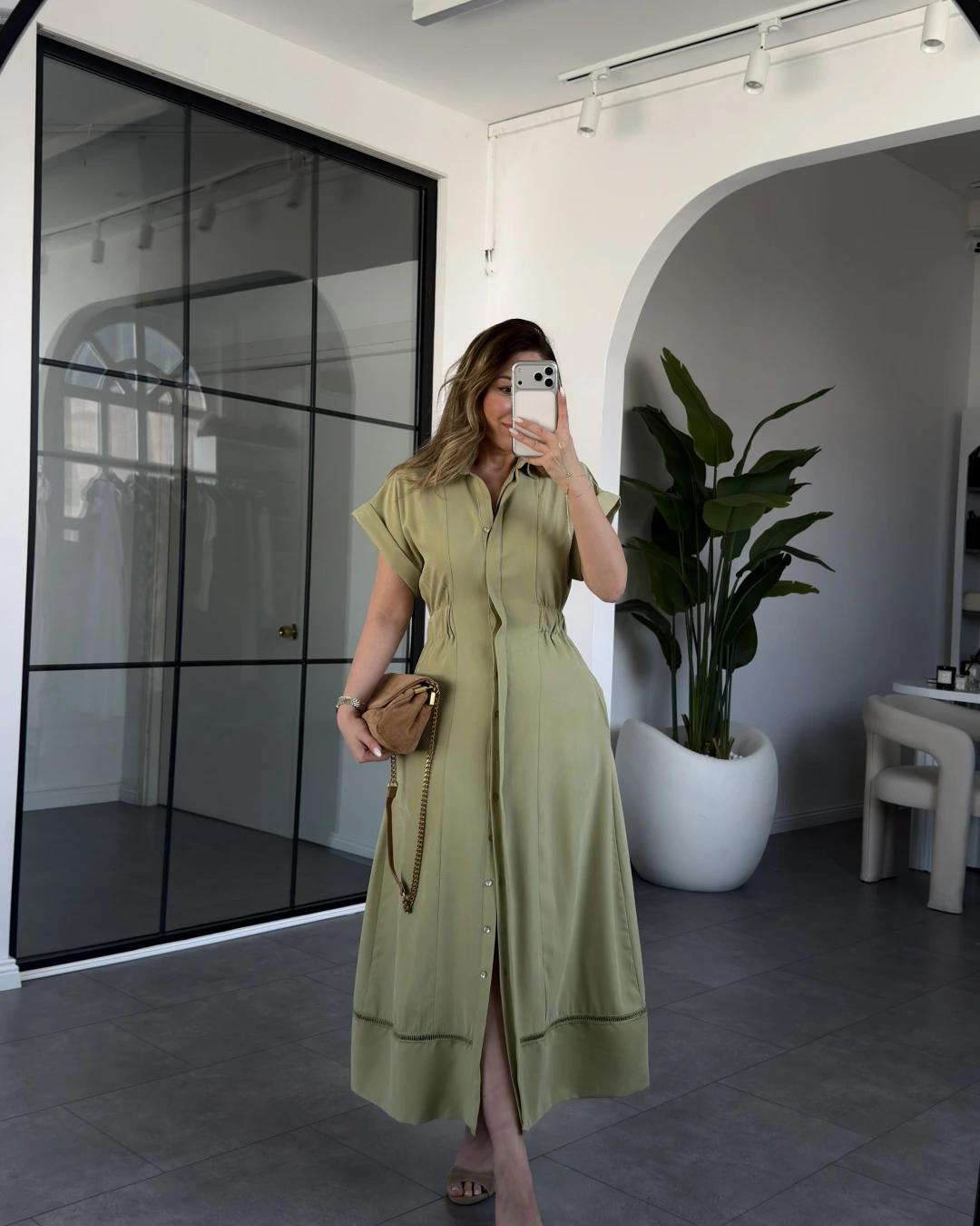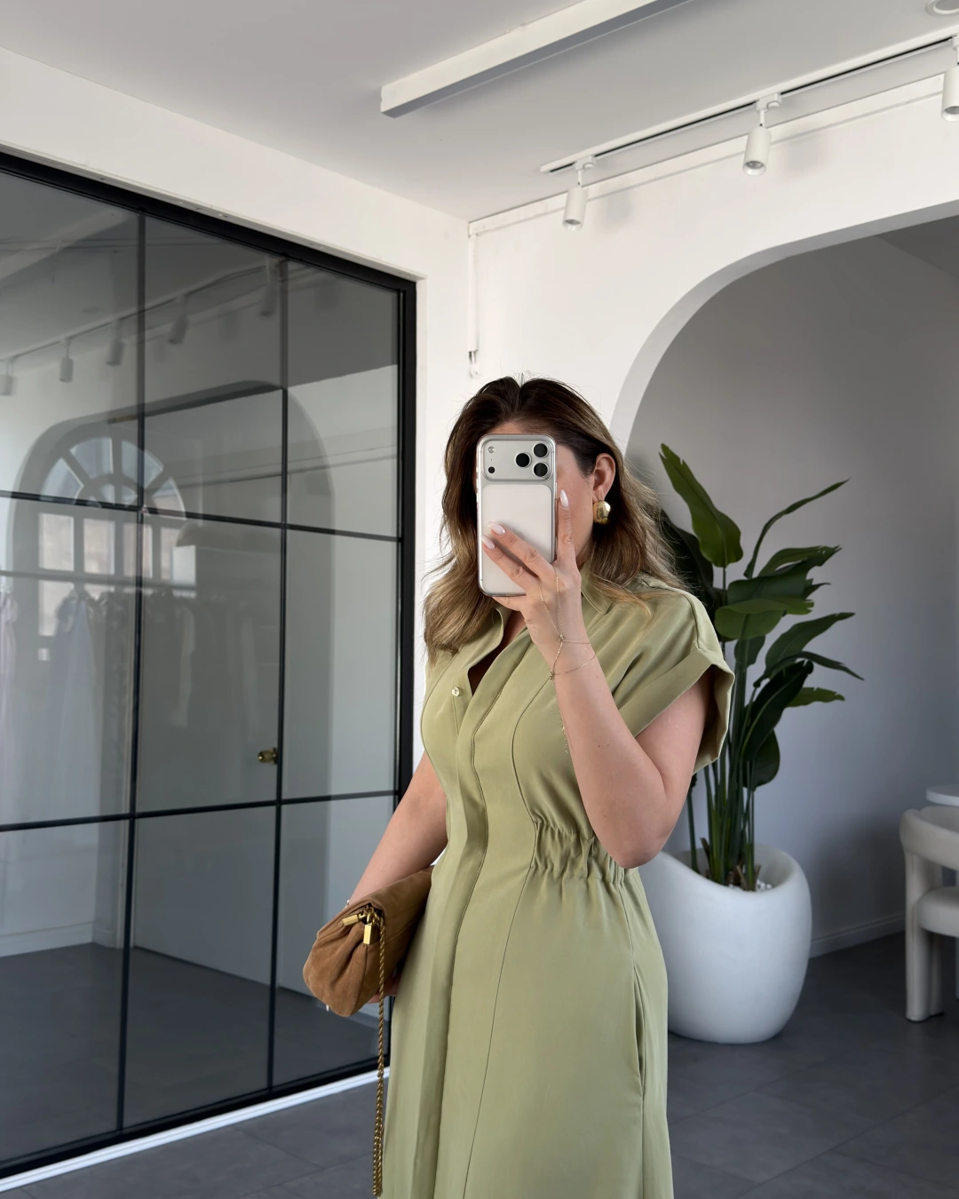 YEŞİL KISA KOL BELİ LASTİKLİ MODAL ELBİSE