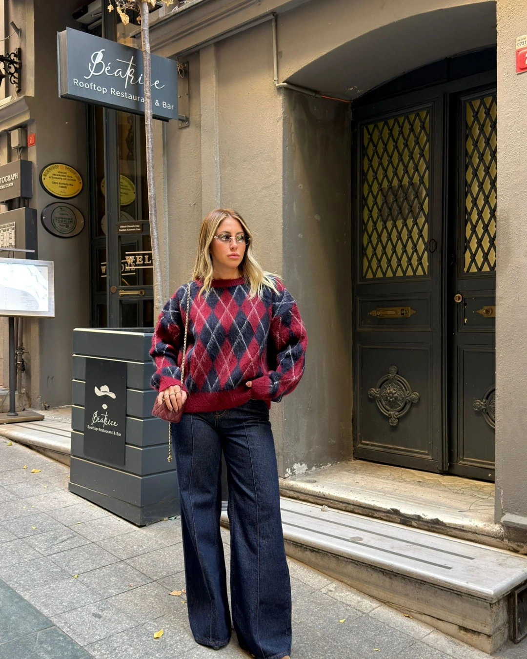 YUVARLAK YAKA BORDO LACİVERT BAKLAVA DESEN KAZAK